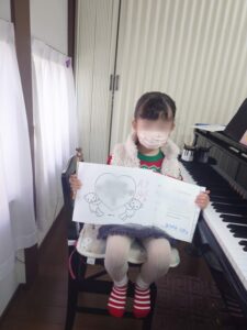 そして12月にピアノ教本,一冊が終了しました。 7月からピアノを初めて約半年…とっても頑張ってくれています♪ 可愛い小さなお手々で最後の曲も上手に弾けたねd(‘∀’*) 偉いぞ~!
