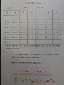 11月のレッスン予定 2025年11月06日 (木) 11月のレッスン予定です♪ 土日は五週ありますので (日)は二週目11/9 (土)は五週目11/29 お休みさせて頂きので宜しくお願い致します。 振替レッスンをご希望の方は,なるだけ早目にご連絡ください。
